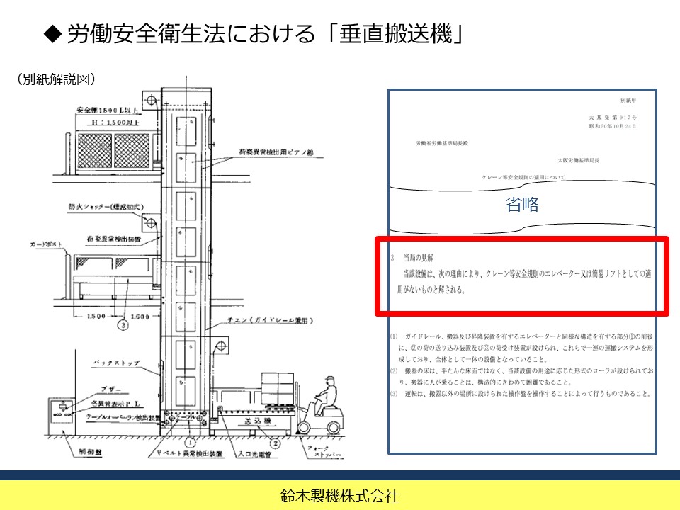 当社では「トレーリフター」「アクトレーター」「ポーリフトオート」が垂直搬送機に該当し、法令の適用を受けません。